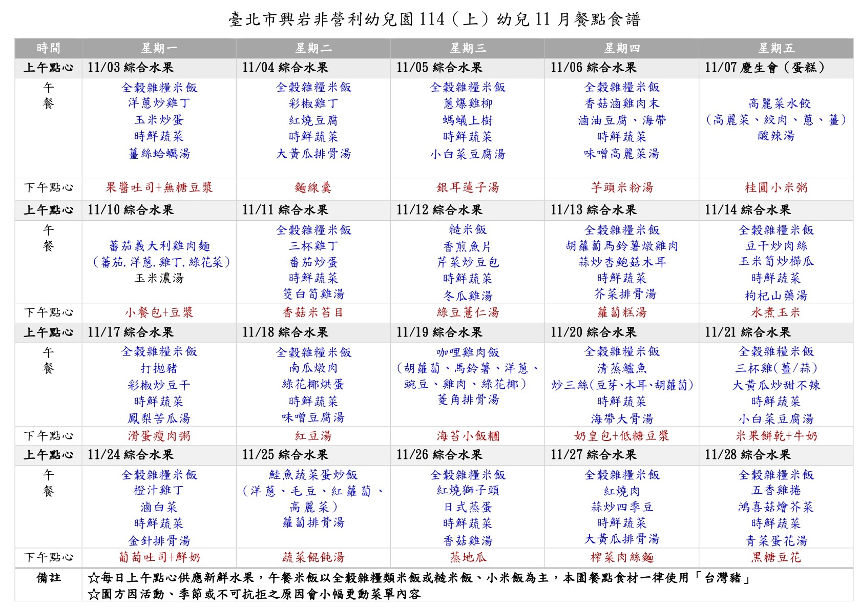 11月餐點表