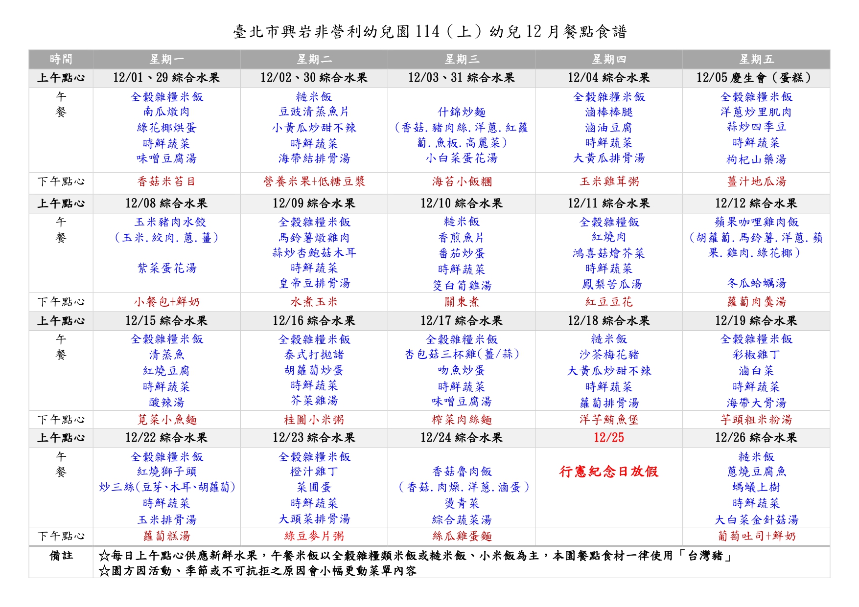 12月餐點表